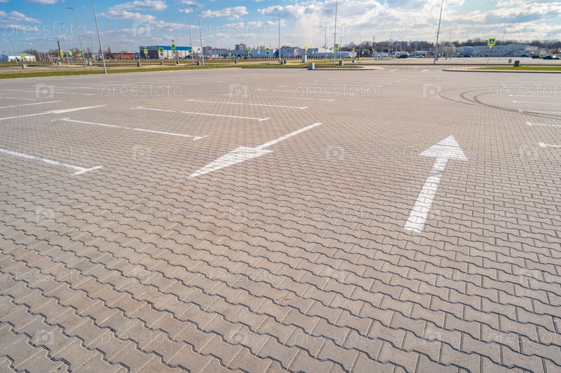 Открытое пространство с дорожными знаками и дорожной разметкой, дорожными перекрестками, пешеходными переходами, солнечным днем, голубым небом, фоном городского пейзажа
