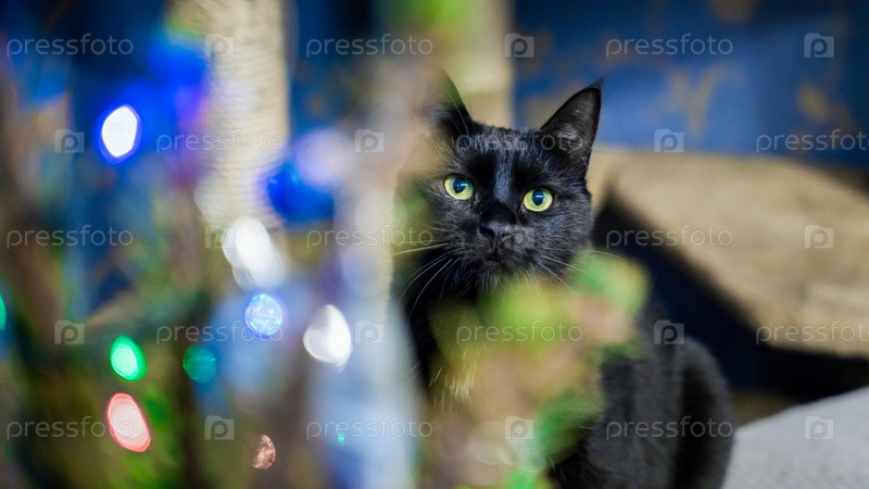 Черный кот с удивлением смотрит на елку с праздничными огнями
