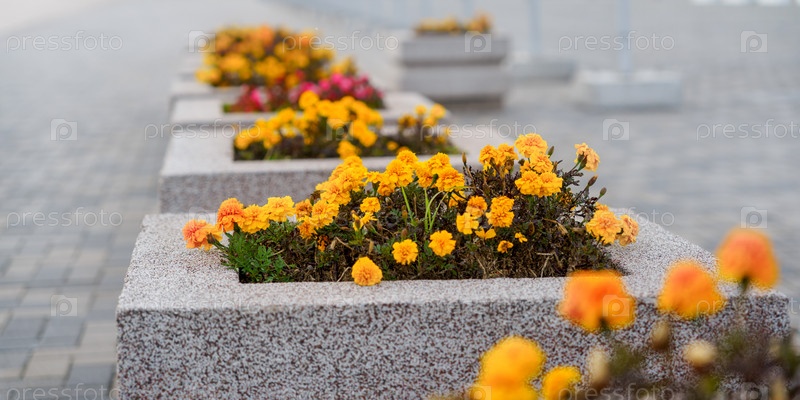 Желтые цветы на клумбах на тротуаре в городе