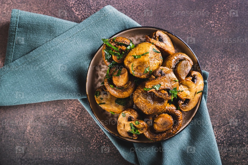 Крупный план нарезанных жареных грибов с травами на тарелке на столе