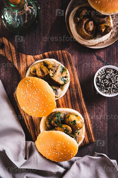 Нарезанные жареные грибы в булочках для гамбургеров на деревянной доске и вертикальный вид
