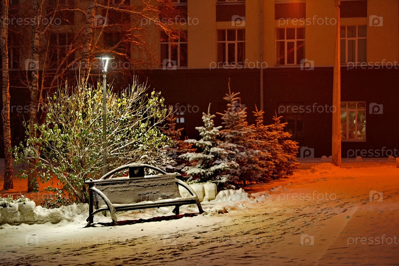 Новокузнецк, Россия. Юг Западной Сибири. Теплая иллюминация в городском заснеженном парке морозным январским утром
