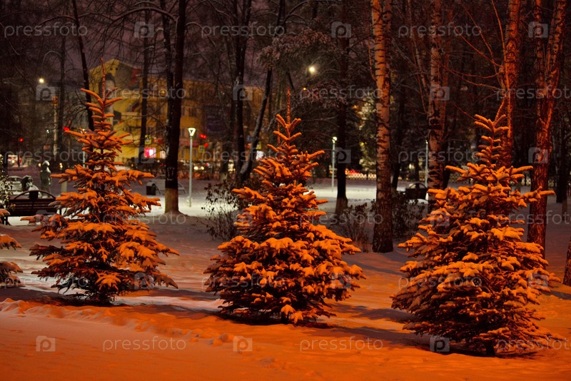 Новокузнецк, Россия. Юг Западной Сибири. Теплая иллюминация в городском заснеженном парке морозным январским утром