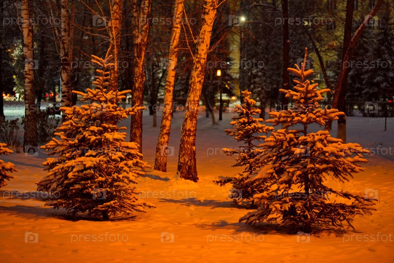 Новокузнецк, Россия. Юг Западной Сибири. Теплая иллюминация в городском заснеженном парке морозным январским утром