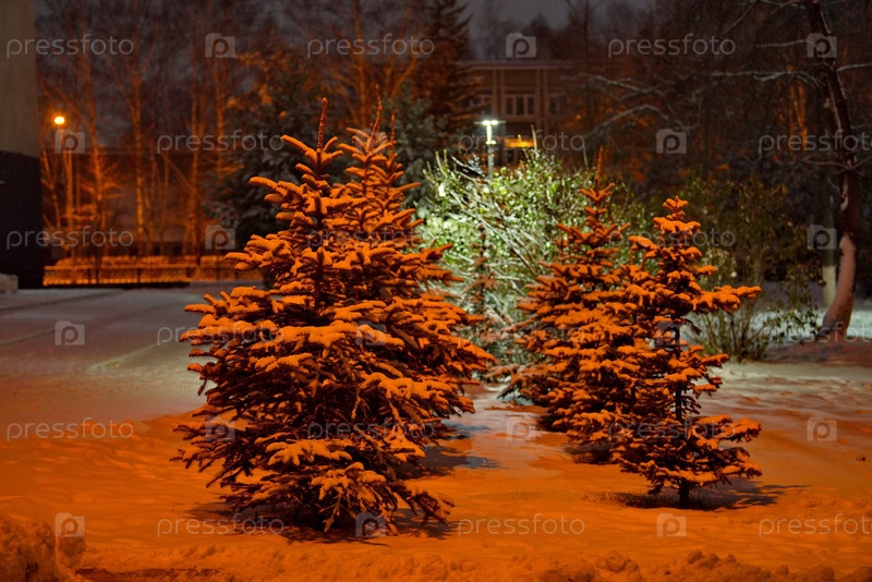 Новокузнецк, Россия. Юг Западной Сибири. Теплая иллюминация в городском заснеженном парке морозным январским утром