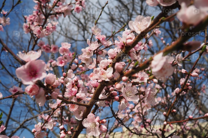 Абрикосовая или персиковая ветвь с цветами весеннего цветения. Розово-фиолетовые цветы весны. Цветы Prunus Armeniaca с пятью листьями от белого до розового цвета. Они производятся по отдельности или парами в начале весны