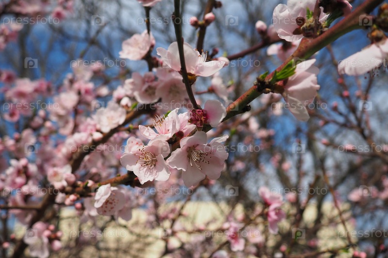 Абрикосовая или персиковая ветвь с цветами весеннего цветения. Розово-фиолетовые цветы весны. Цветы Prunus Armeniaca с пятью листьями от белого до розового цвета. Они производятся по отдельности или парами в начале весны