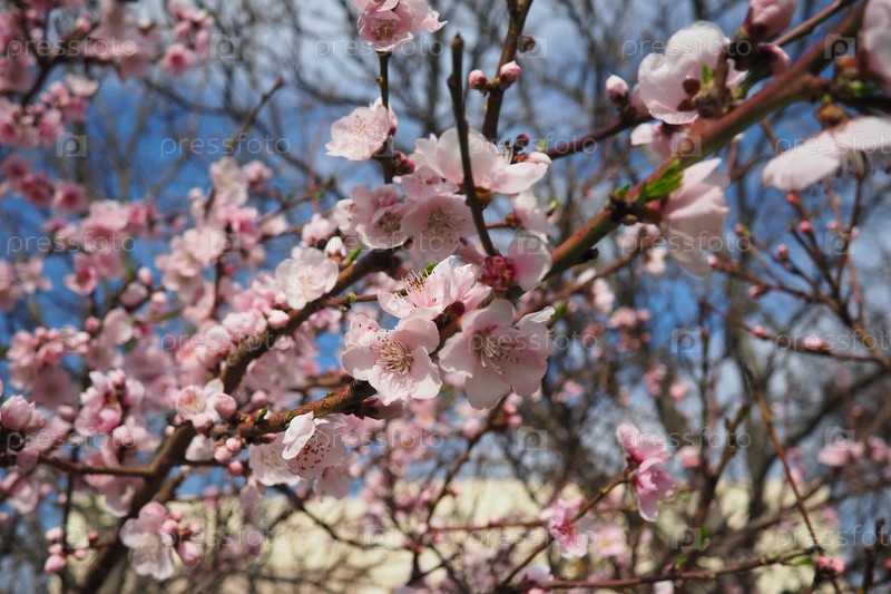 Ветвь абрикоса или персика с цветами весеннего цветения. Розово-фиолетовые цветы весны. Цветы Prunus Armeniaca с пятью листьями от белого до розового цвета. Они производятся по отдельности или парами в начале весны