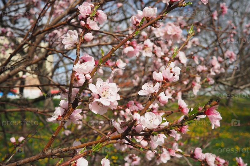 Абрикосовая или персиковая ветвь с цветами весеннего цветения. Розово-фиолетовые цветы весны. Цветы Prunus Armeniaca с пятью листьями от белого до розового цвета. Они производятся по отдельности или парами в начале весны
