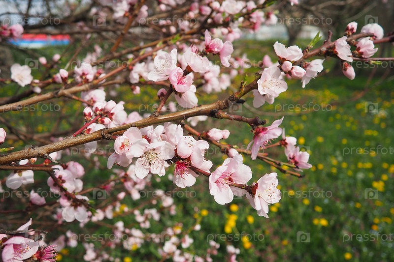 Ветвь абрикоса или персика с цветами весеннего цветения. Розово-фиолетовые цветы весны. Цветы Prunus Armeniaca с пятью листьями от белого до розового цвета. Они производятся по отдельности или парами в начале весны