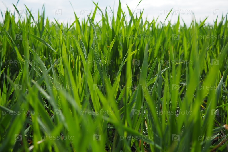 Хорошие урожаи озимой пшеницы на весеннем поле. Зеленые ростки озимой пшеницы. Вид на зеленый луг с растущей травой молодых злаков. Сельскохозяйственный бизнес. Тритикум эстивум