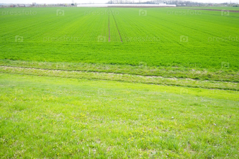 Хорошие урожаи озимой пшеницы на весеннем поле. Зеленые ростки озимой пшеницы. Вид на зеленый луг с растущей травой молодых злаков. Сельскохозяйственный бизнес. Тритикум эстивум
