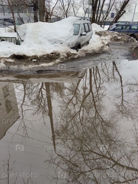 Машина в снегу в городе весной