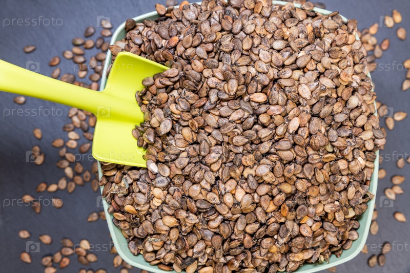 Семена арбуза на черном каменном столе и в тарелке с мерной ложкой