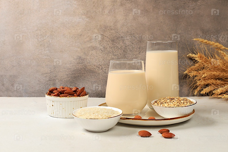 Веганское альтернативное молоко без лактозы и глютена, без аллергии, миндаль, рис, овес и стаканы напитков на кухонном столе, концепция здорового питания, диетическое питание, потеря веса, избирательный фокус