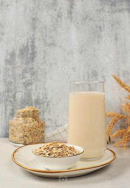 Овсянка, веганское альтернативное молоко, без лактозы и глютена, без аллергии, концепция здорового питания, поддержание здоровой кишечной флоры, диетическое питание, потеря веса, избирательный фокус