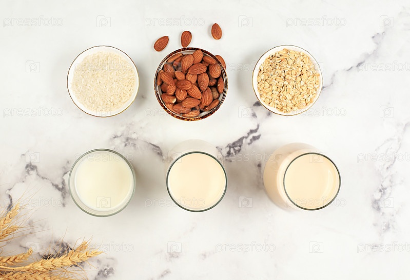 Веганское альтернативное молоко без лактозы и глютена, без аллергии, миндаль, рис, овес и стаканы напитков на кухонном столе, концепция здорового питания, диетическое питание, потеря веса