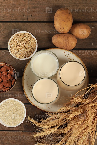Веганское альтернативное молоко без лактозы и глютена, без аллергии, миндаль, рис, овес, картофель и стаканы напитков на деревянном столе, концепция здорового питания, диетическое питание, потеря веса, избирательный фокус