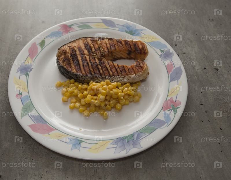 Стейк лосося на гриле в оливковом масле и провансальских травах с кукурузными зернами на тарелке с узорами на столе