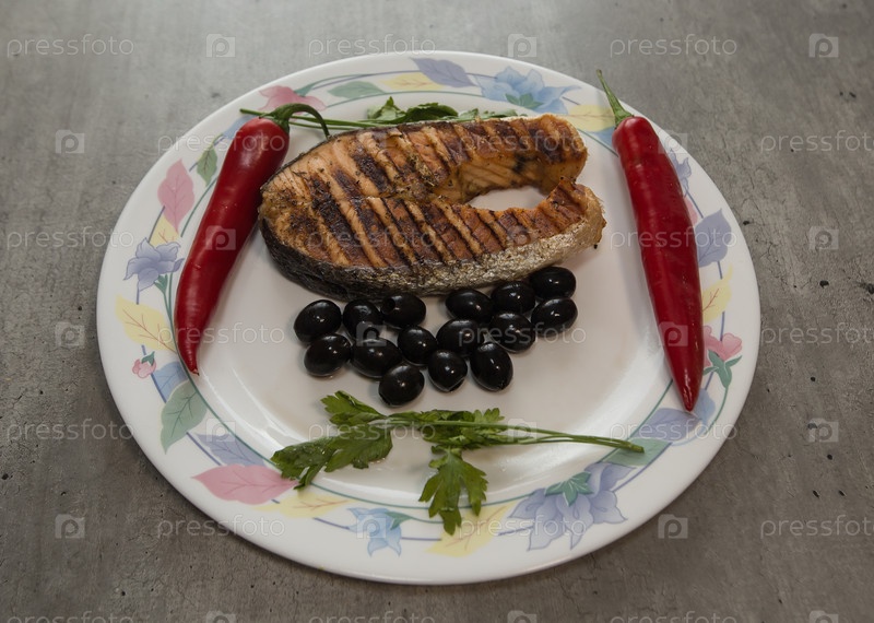 Стейк лосося на гриле в оливковом масле и провансальских травах с черными оливками, стручками красного перца и пучком петрушки на тарелке с узорами на столе