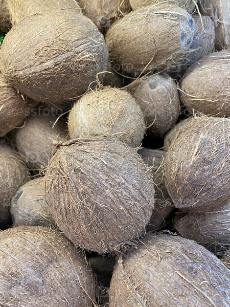 В коробке много кокосов, спелых, сладких, вкусных
