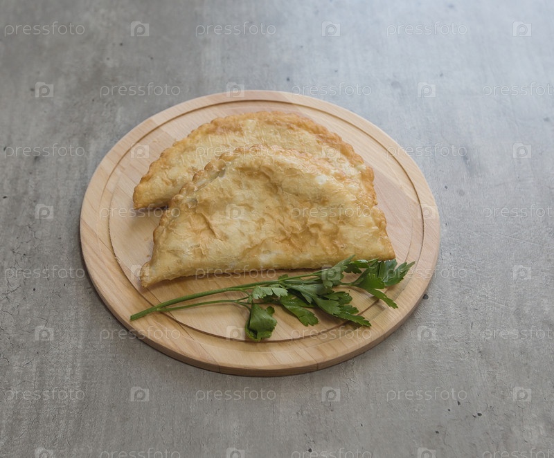Жареные чебуреки с мясом и петрушкой на деревянной подставке на столе