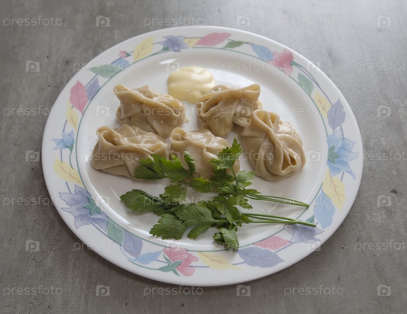 Каспийские манты, приготовленные на пару с майонезом и петрушкой на тарелке с узорами на столе