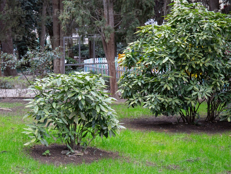 Красивые деревья весной на южном берегу Крыма в Ялте.Аукуба японская