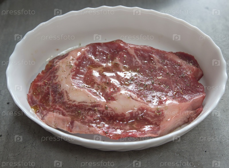 Размороженный стейк Рибай в оливковом масле и провансальских травах перед приготовлением на тарелке