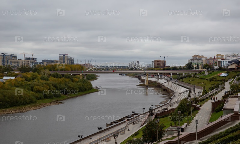 Красивая гранитная набережная реки Туры Тюмени осенью