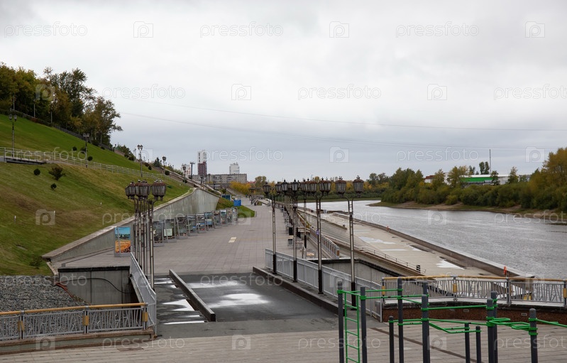 Красивая гранитная набережная реки Туры Тюмени осенью