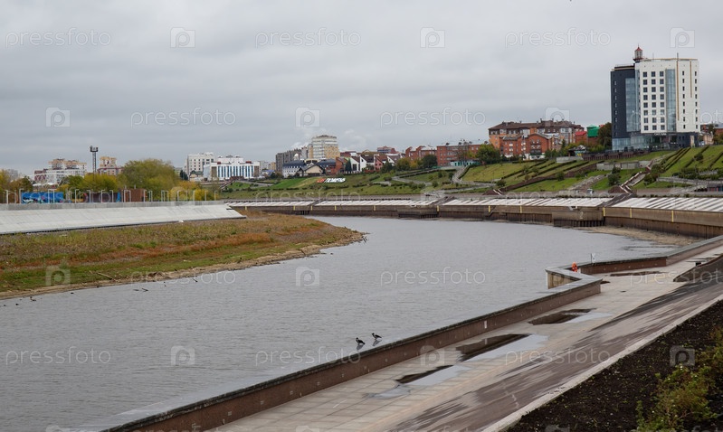 Красивая гранитная набережная реки Туры Тюмени осенью