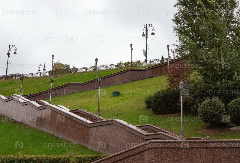 Красивая гранитная набережная реки Туры Тюмени осенью