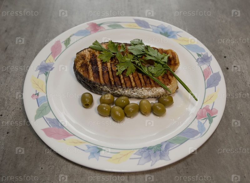 Стейк лосося на гриле в оливковом масле и провансальских травах с зелеными оливками и веточкой петрушки на тарелке с узорами на столе