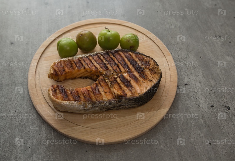 Стейк из лосося на гриле с оливковым маслом и прованскими травами с плодами алычи на деревянной подставке