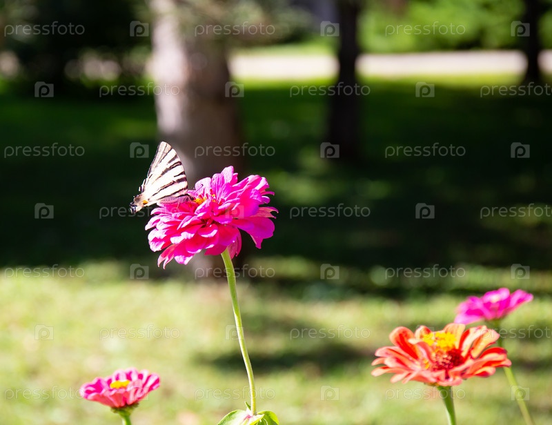Красивая бабочка на красивом цветке в старом парке летом