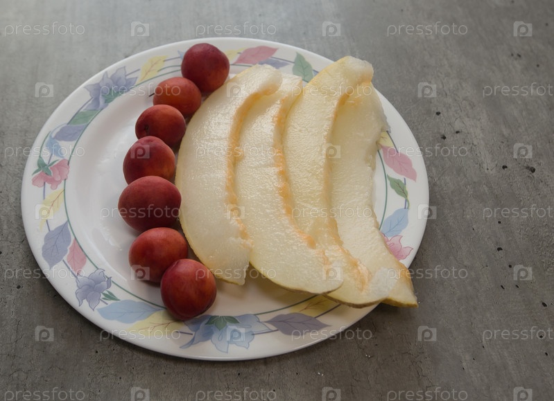 Узбекская дыня, узбекская дыня, нарезанная ломтиками, и плоды красного абрикоса на тарелке с узорами на столе