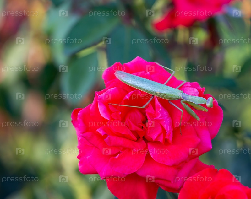 Зеленый богомол на красной розе в старом парке летом