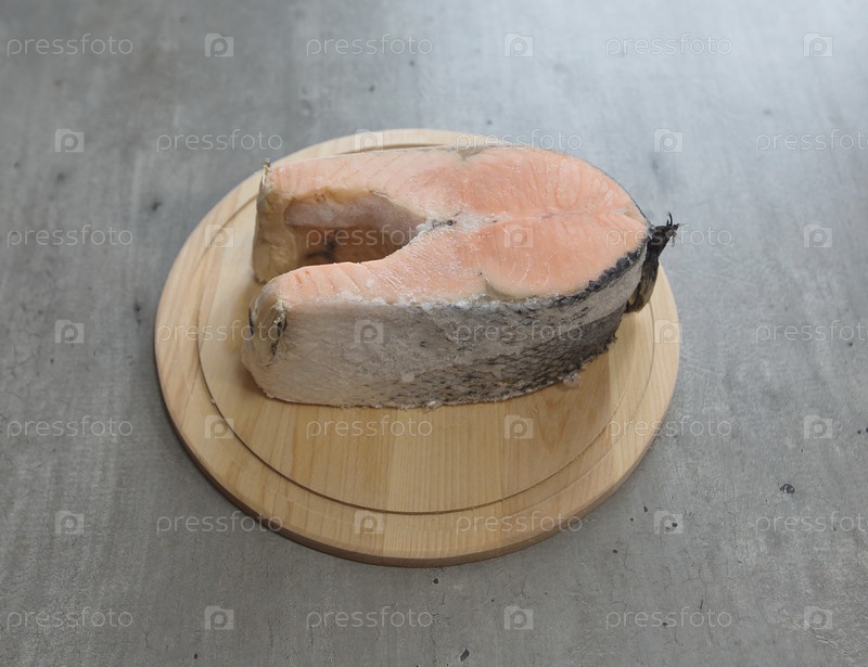 Стейк из лосося на деревянной доске перед приготовлением на столе