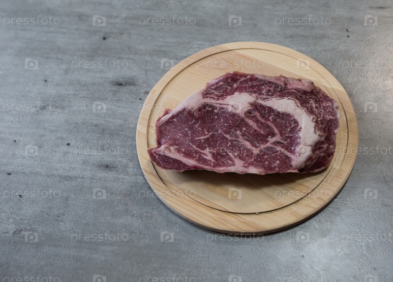 Стейк Рибай из мраморной говядины на деревянной доске перед приготовлением на столе