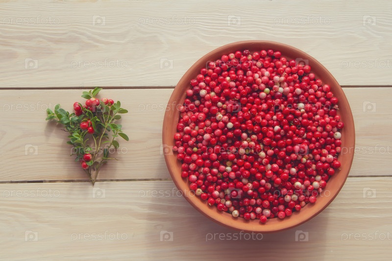 Свежая спелая брусника (брусника, куропатка, брусника) в глиняной миске на деревенском деревянном столе, вид сверху