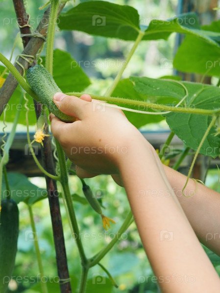 Ребенок руками собирает свежие органические огурцы, собирая овощи в домашнем саду. Здоровая домашняя вегетарианская еда для детей. Летние каникулы в стране