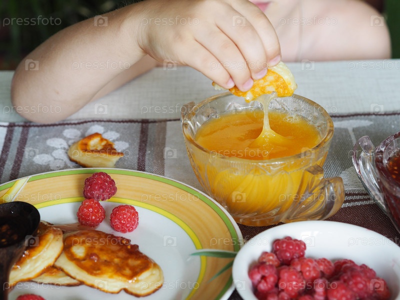 завтрак. Ребенок ест блины с медом руками. Детское питание и аллергия