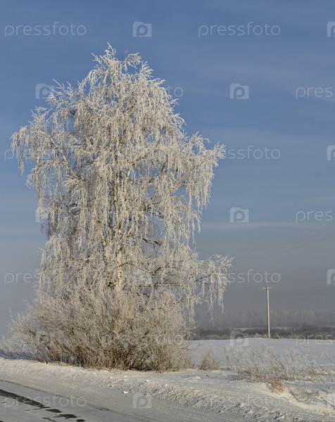 Россия. Юг Западной Сибири, Кузбасс. Зимние деревья, покрытые белым инеем вдоль дороги к деревне Осиновое Плесо