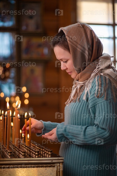 Молодая женщина в деревянном храме стоит у подсвечника