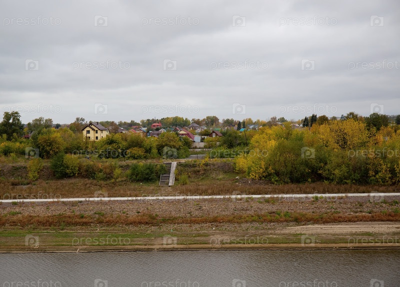 Вид на другой берег реки Туры с гранитной набережной Тюмени осенью