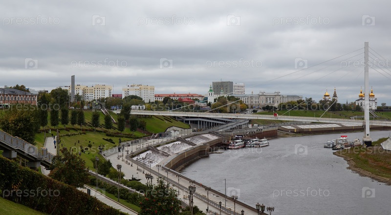 Вид с гранитной набережной на мост влюбленных в Тюмени осенью
