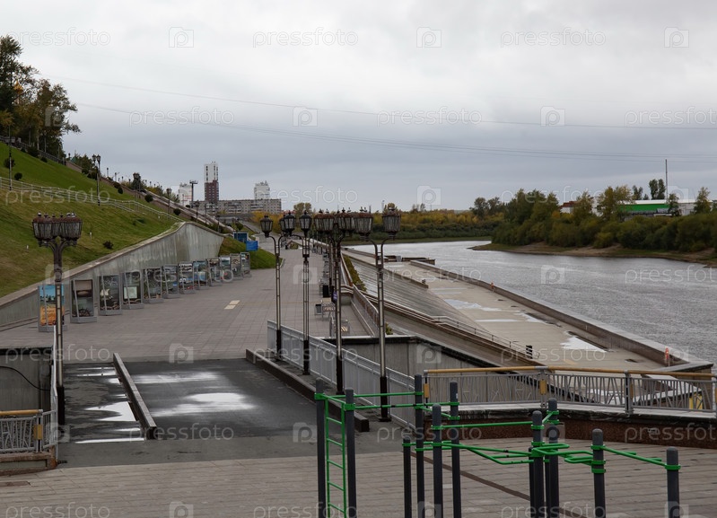 Красивая гранитная набережная реки Туры Тюмени осенью