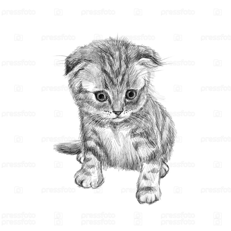 Котенок, нарисованный вручную карандашом, черно-белая иллюстрация котенка, изолированная на белом фоне, карандашный набросок