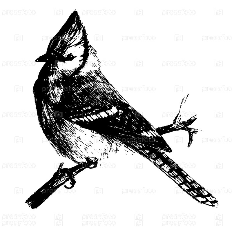 Голубая сойка, реалистичный рисунок, заштрихованный карандашом, нарисованный от руки черно-и